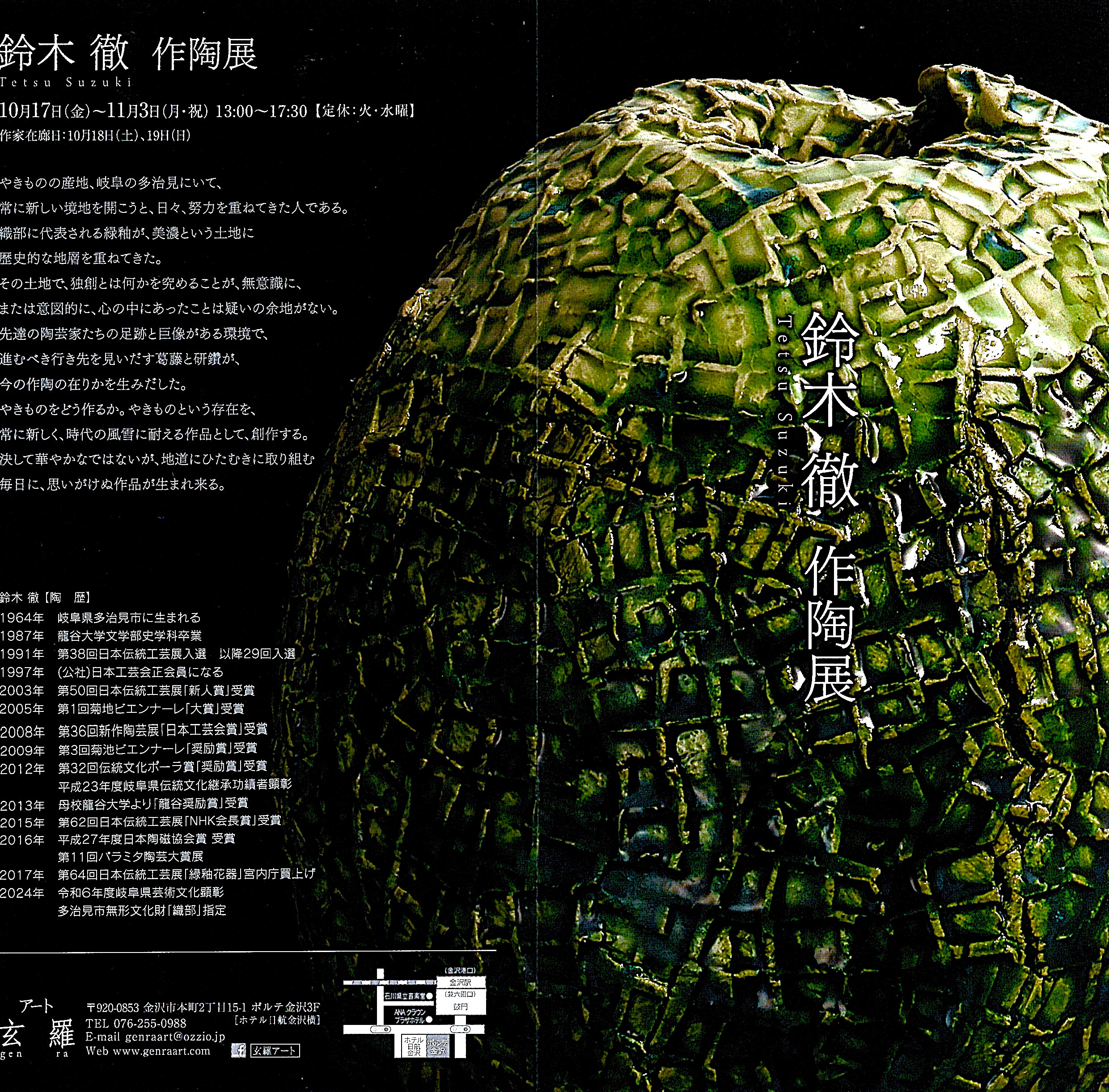 鈴木 徹 作陶展 玄羅アート 2025年10月17日(金) ~ 11月20日(木) 鈴木 徹 作陶展 髙島屋大阪店美術画廊 2026年3月25日(水) ~ 3月30日(月) 鈴木 徹 作陶展 髙島屋京都店美術画廊 2026年5月20日(水) ~ 5月25日(月) 鈴木 徹 作陶展 JR名古屋髙島屋美術画廊 2026年7月1日(水) ~ 7月7日(火)
